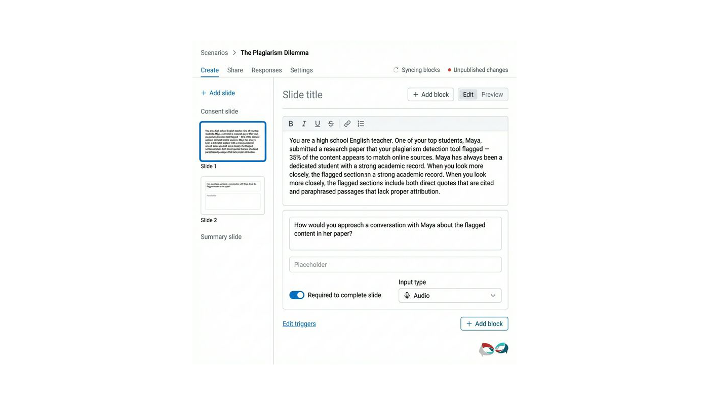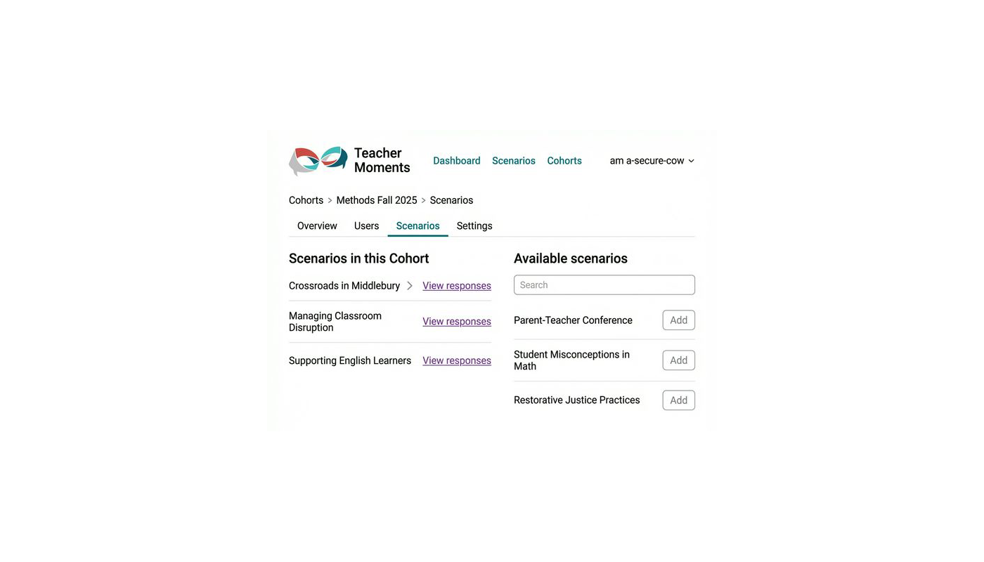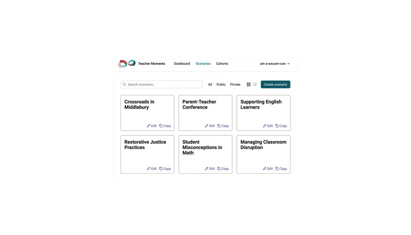 Teacher Moments is a collaborative project with Justin Reich, Erin Barno, and the Teaching Systems Lab at MIT. The project explores how AI-supported simulations can support our educators in preparing for challenging real-life scenarios using a robust collection of existing teaching scenarios developed by MIT teacher educators and partners. We've partnered with the team and teachers to build a tool to empower educator learning and are excited about its future.
