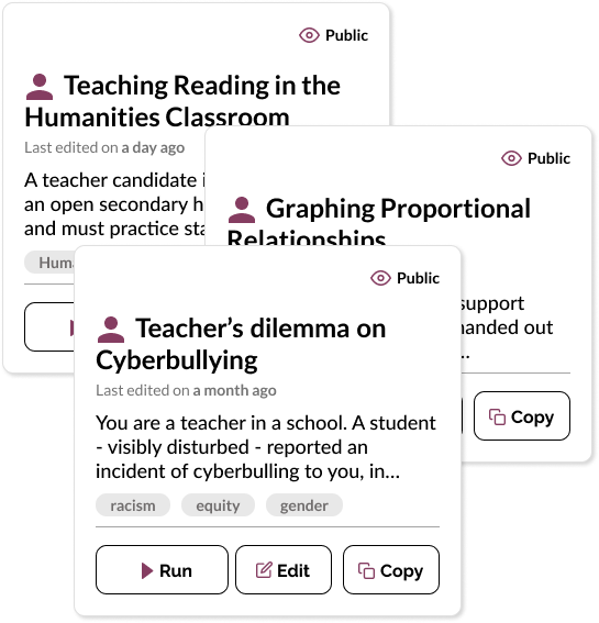 Teacher Moments is a collaborative project with Justin Reich, Erin Barno, and the Teaching Systems Lab at MIT. The project explores how AI-supported simulations can support our educators in preparing for challenging real-life scenarios using a robust collection of existing teaching scenarios developed by MIT teacher educators and partners. We've partnered with the team and teachers to build a tool to empower educator learning and are excited about its future.
